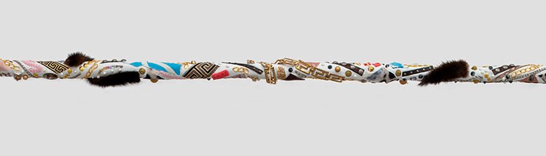 In the past, horror vacui, or the fear of emptiness, was often employed in art and was considered sacred and highly regarded. Today, minimalism represents refinement and luxury while maximalism is unrefined and cheap. Ryals’ Rugs series highlights the casino floor, the detrital glory of belongings lost, and gambling paraphernalia hidden. The selection of collage materials is informed by the classic iconography of Las Vegas, such as spas, pools, steakhouses, buffets, hotel lobbies, casino floors, and wedding chapels. Ryals incorporates poker chips, playing cards, bra straps, peacock feathers and much more into the shape of a seventeenth century Savonnerie French rug pattern. The resulting image is photographed with a high-resolution camera and printed mechanically onto a velvet rug. What many would consider trash, is transformed to create the illusion of luxury. The rugs reference what is, in today’s fast fashion world, considered unattainable, the opulence of a hand-crafted, hand-woven textile wall hanging or rug.
