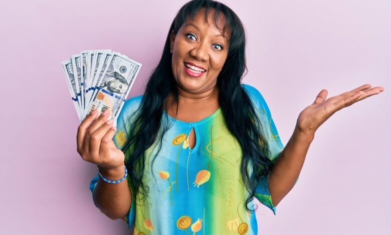 Middle-aged woman smiling and holding money