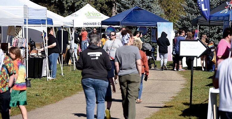 People stroll through the set-ups of the vendors during Saturday’s Austin, MN Pride Fest Saturday at Bandshell Park. Eric Johnson/photodesk@austindailyherald.com