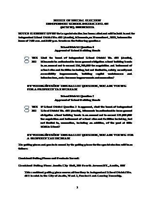 NOTICE IS HEREBY GIVEN that a special election has been called and will be held in and for Independent School District No. 492 (Austin), Minnesota, on November 4, 2025, between the hours of 7:00 a.m. and 8:00 p.m. to vote on the following questions:
