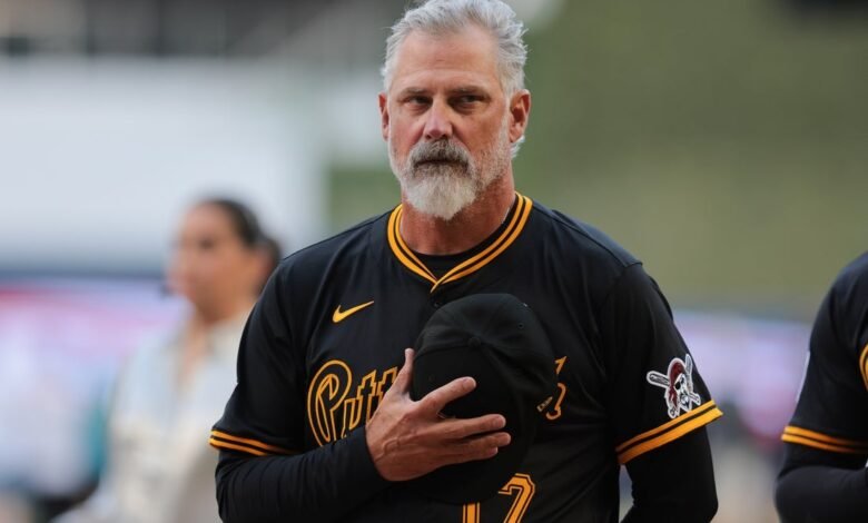 MLB: Pittsburgh Pirates at Miami MarlinsMar 27, 2025; Miami, Florida, USA; Pittsburgh Pirates manager Derek Shelton (17) listen to the national anthem before the game against the Miami Marlins at loanDepot Park. Mandatory Credit: Sam Navarro-Imagn Images