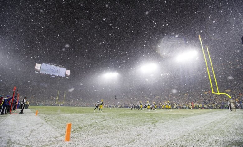 NFL: Carolina Panthers at Green Bay PackersGeneral view of snow falling during the fourth quarter at Lambeau Field. Mandatory Credit: Jeff Hanisch-Imagn Images