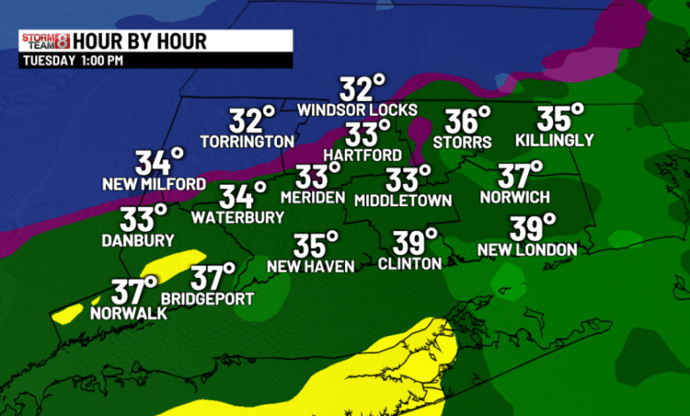 Snow/Ice/Slippery Northern CT into this evening. Wet across Southern and Eastern CT. Slippery across the entire state to start Wednesday.