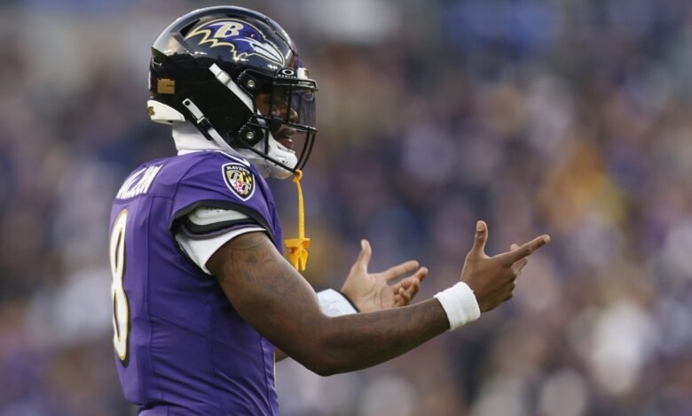 NFL: Pittsburgh Steelers at Baltimore RavensDec 7, 2025; Baltimore, Maryland, USA; Baltimore Ravens quarterback Lamar Jackson (8) reacts after a play against the Pittsburgh Steelers during the second half at M&T Bank Stadium. Mandatory Credit: Peter Casey-Imagn Images