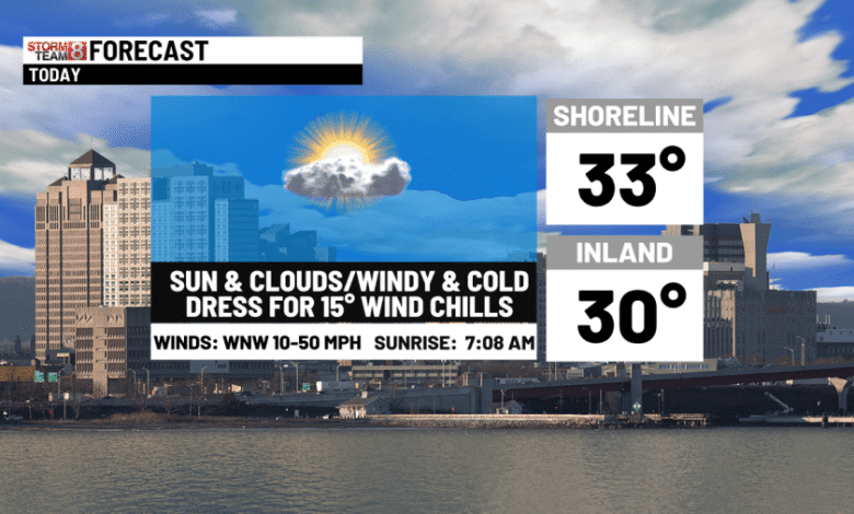 Wind advisory into Friday morning and very cold. Bright and brisk Friday afternoon. More clouds and more seasonable Saturday. Light snow Sunday!