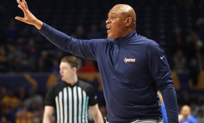 Jan 10, 2026; Pittsburgh, Pennsylvania, USA; Syracuse Orange head coach Adrian Autry reacts on the sidelines against the Pittsburgh Panthers during the first half at the Petersen Events Center. Mandatory Credit: Charles LeClaire-Imagn Images Donnie Freeman was on top of his game again Saturday, hitting three 3-pointers and pouring in 22 points as Syracuse won its second in a row with an 83-72 victory over Pitt in Pittsburgh, Pa.