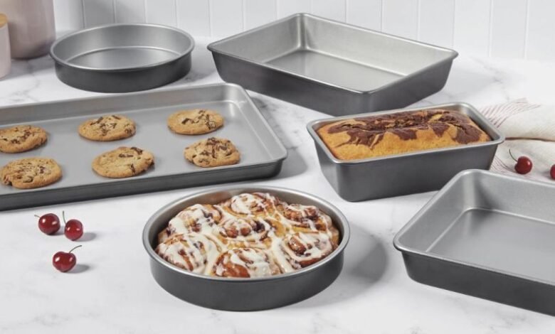 This durable set includes a 9″ Loaf Pan, a 9″ Square Cake Pan, two 9″ Round Cake Pans, a 13″ x 9″ Cake Pan, and a 17″ Baking Sheet.