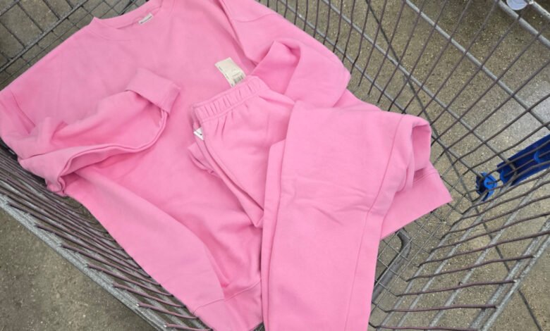 Pink No Boundaries sweat shirt and pants in a cart at Walmart.