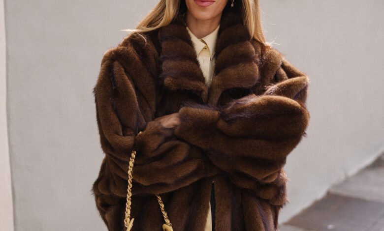 brown faux fur coat yellow button down shirt grey pants yellow tote red flats