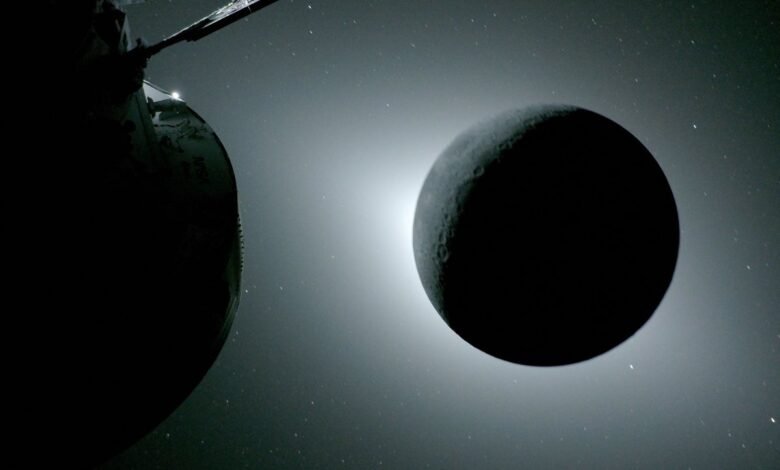 The Artemis II crew’s view of a solar eclipse from the Orion spacecraft.