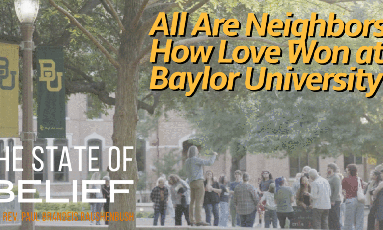 Is the tide finally turning on the bigotry, fear-mongering and manufactured division in our society, including on college campuses? The success of a joyful gathering last week at traditionally Baptist Baylor University in Waco, Texas, suggests it might be. This week on The State of Belief, host Rev. Paul Brandeis Raushenbush brings us with him to the Baylor campus, sharing his own words of welcome from the All Are Neighbors gathering, as well as powerful remarks from two student organizers, Rev. Susie Hayward, an unstoppable faith activist from Minnesota, Dr. Greg Garrett (whom TPUSA has included in its “professor watch list,”) and Human Rights Campaign President Kelly Robinson.