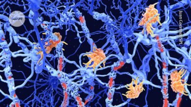 An artist’s impression of nerve cells (blue) showing damage (red) caused by the degenerative disease multiple sclerosis.Credit: Juan Gaertner/SPL The…